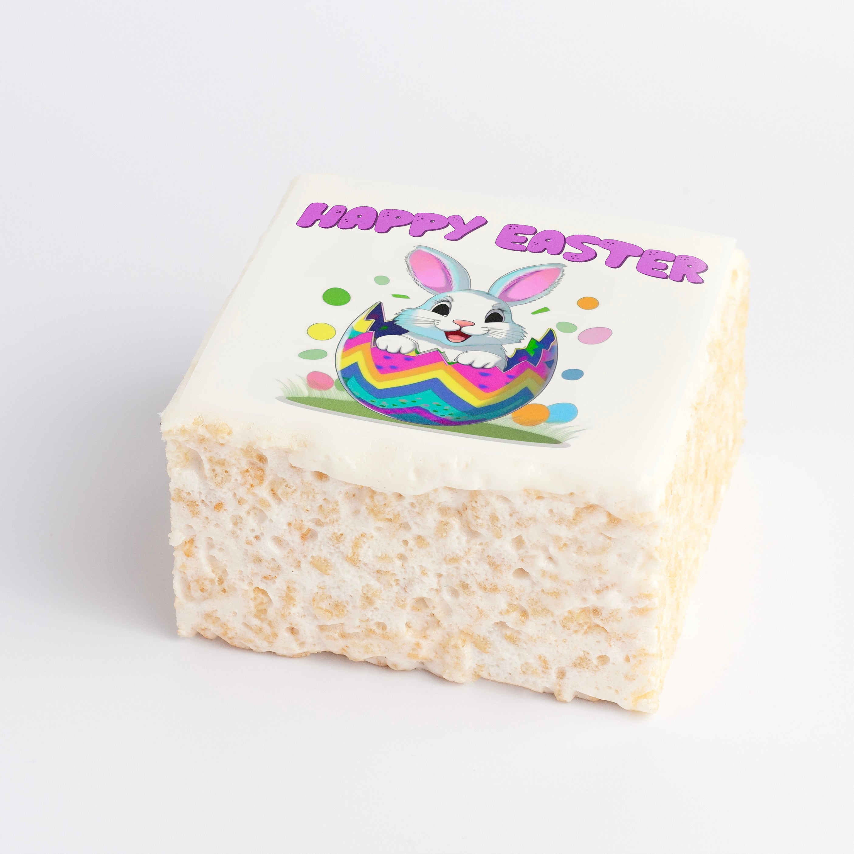 This festive Crispycake features our signature soft and gooey marshmallow base, topped with smooth edible fondant printed with an adorable Easter bunny popping out of a colorful egg. It’s the perfect treat to tuck into baskets, share at brunch, or brighten someone’s holiday with a little marshmallow magic.