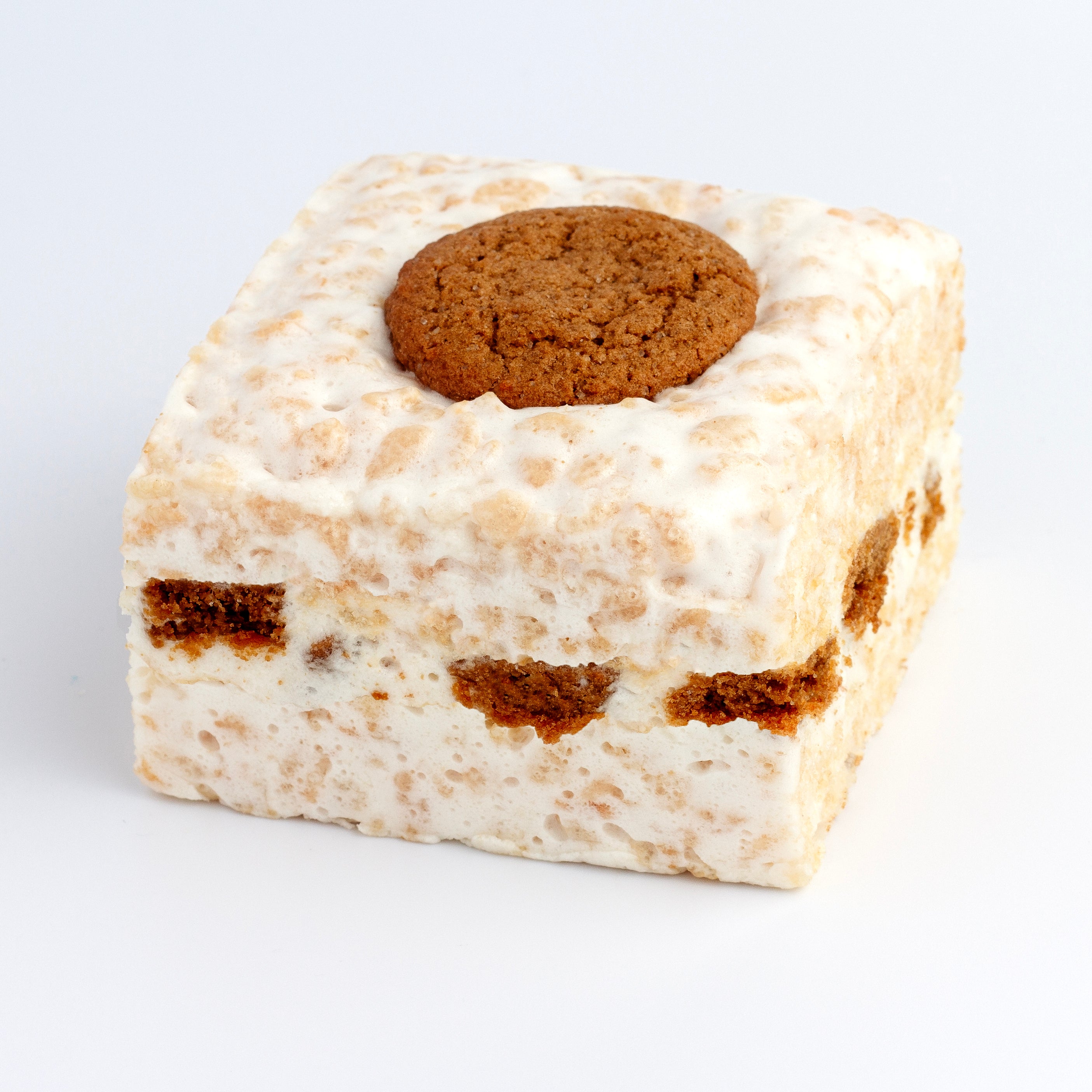 Crushed gingersnap cookies are blended into our gooey marshmallow Crispycake and topped with a whole cookie for that perfect bite of crunch and spice. It’s a fall favorite with year-round fan status—comforting, cozy, and just the right amount of snap.