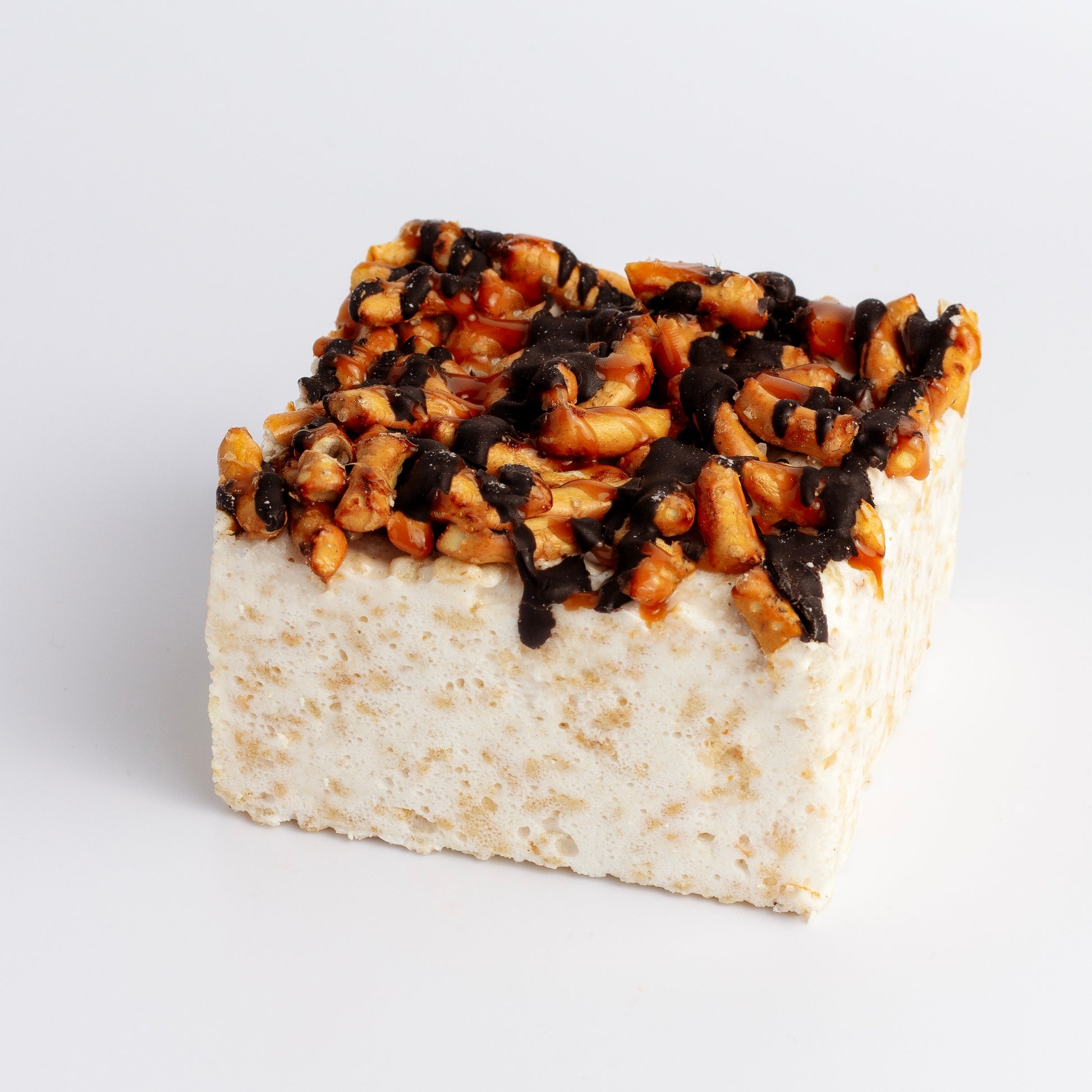 Our signature marshmallow Crispycake topped with crunchy pretzel bits and a generous drizzle of rich chocolate. The perfect combo of salty and sweet this favorite is bold, balanced, and made to satisfy every craving.