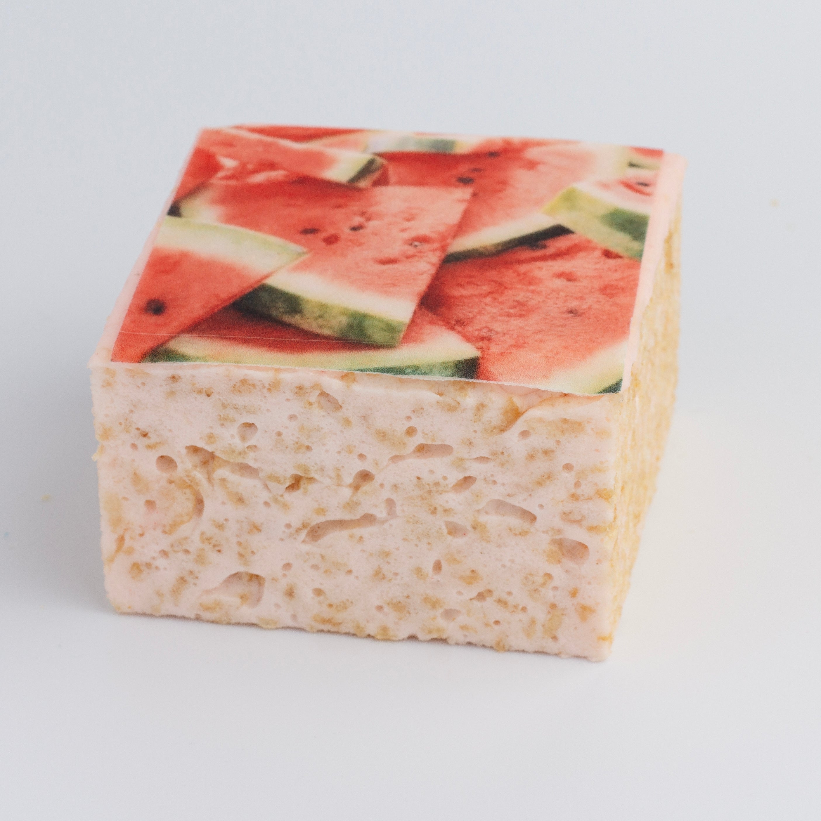 Sweet, juicy, and bursting with watermelon flavor, this tropical Crispycake is like summer in snack form. Topped with an edible watermelon image and packed with that bold, candy-like watermelon taste (you know the one!), it’s a refreshingly fun twist on our classic marshmallow treat. Perfect for poolside snacking, beach days, or just dreaming of warmer weather.
